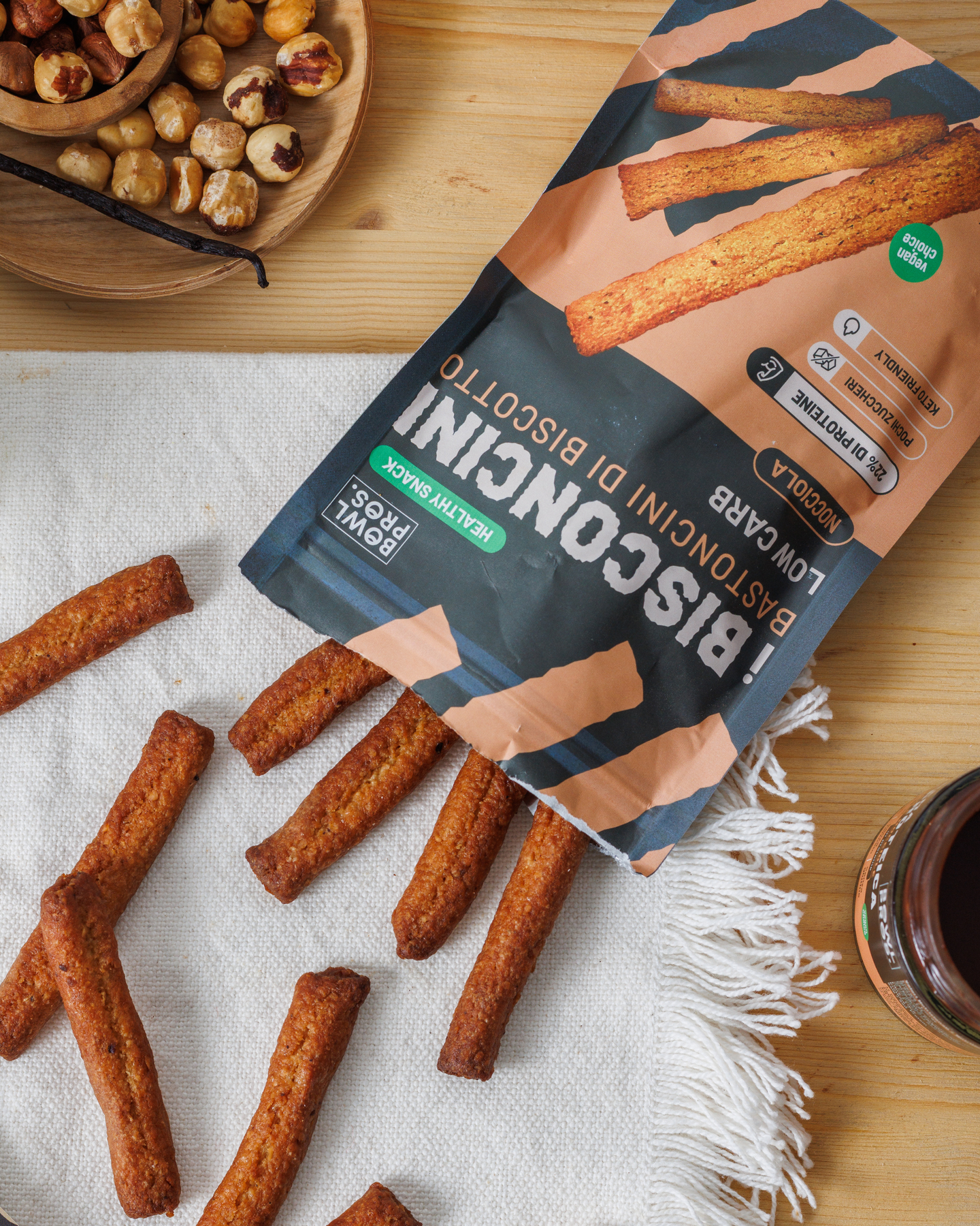 I Bisconcini Bowlpros alla Nocciola sono biscotti proteici pensati per chi vuole uno snack buono, sano e con pochi carboidrati.