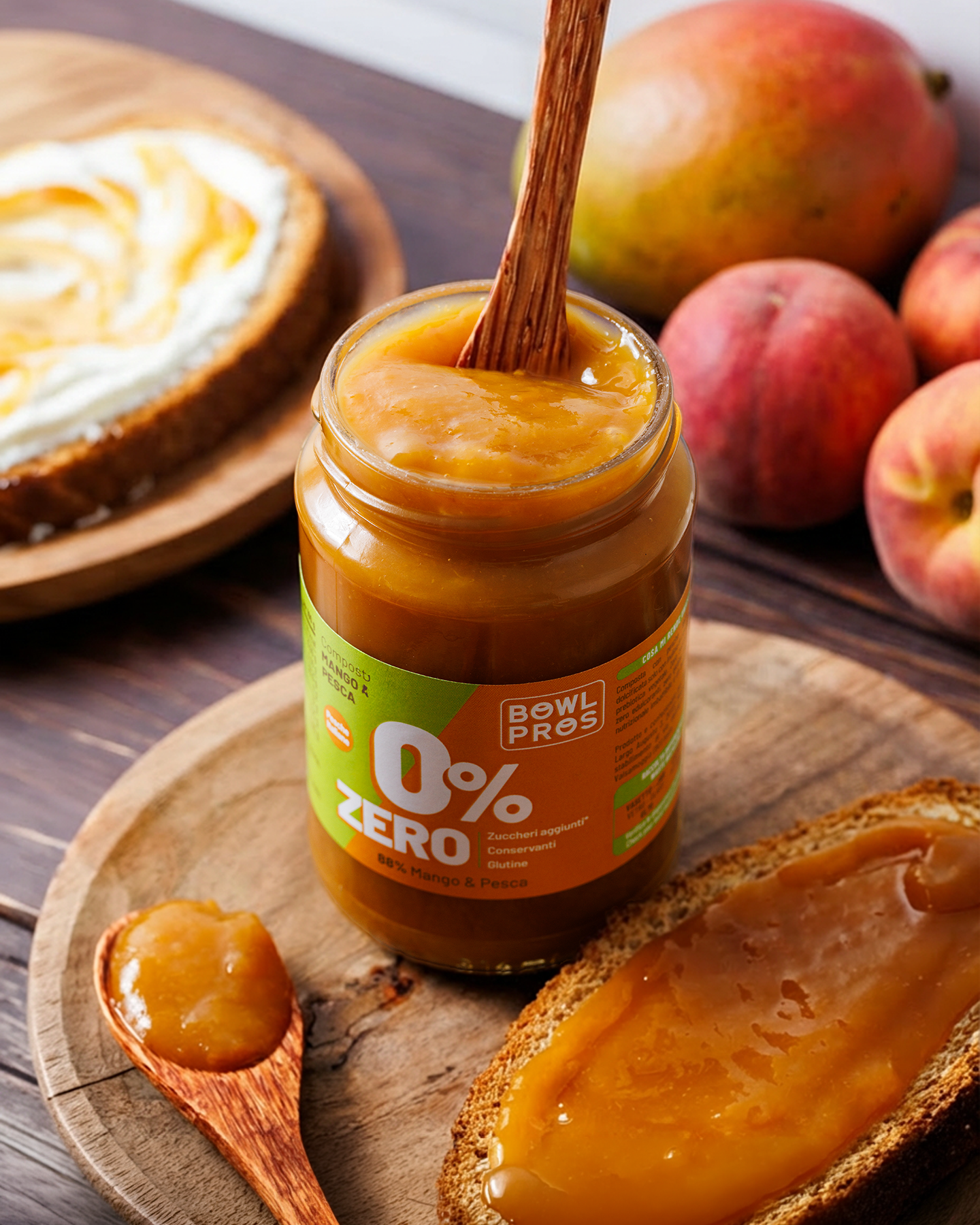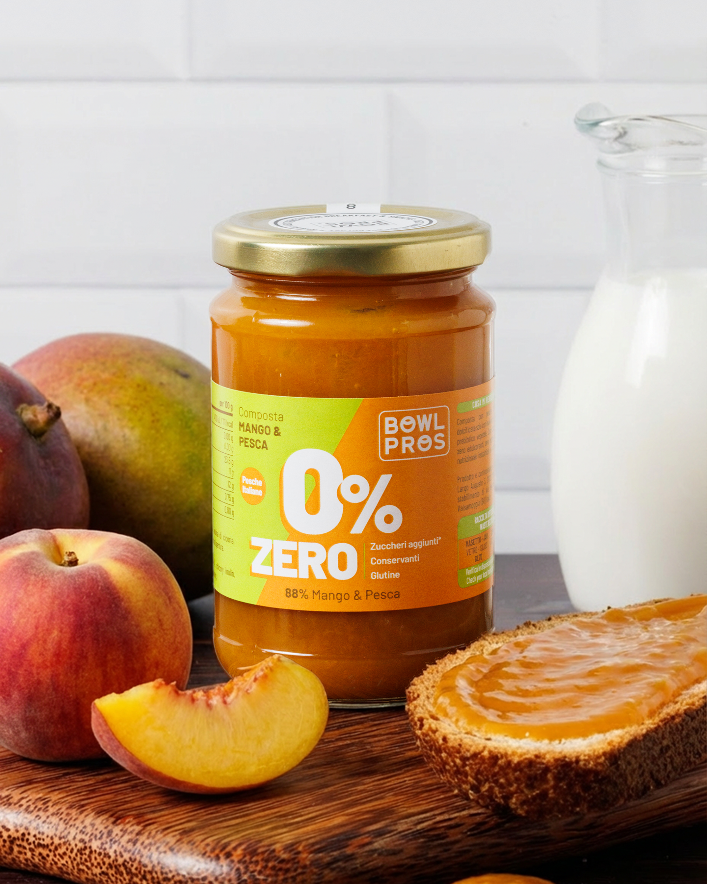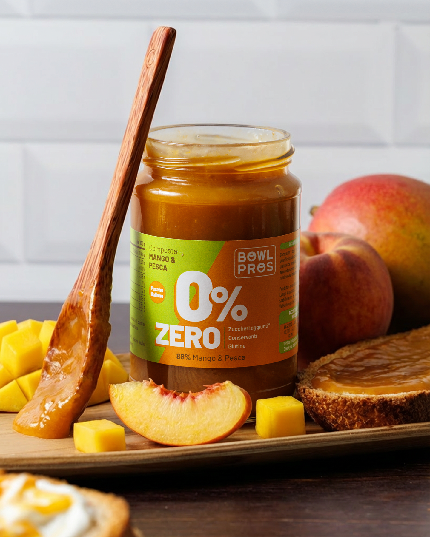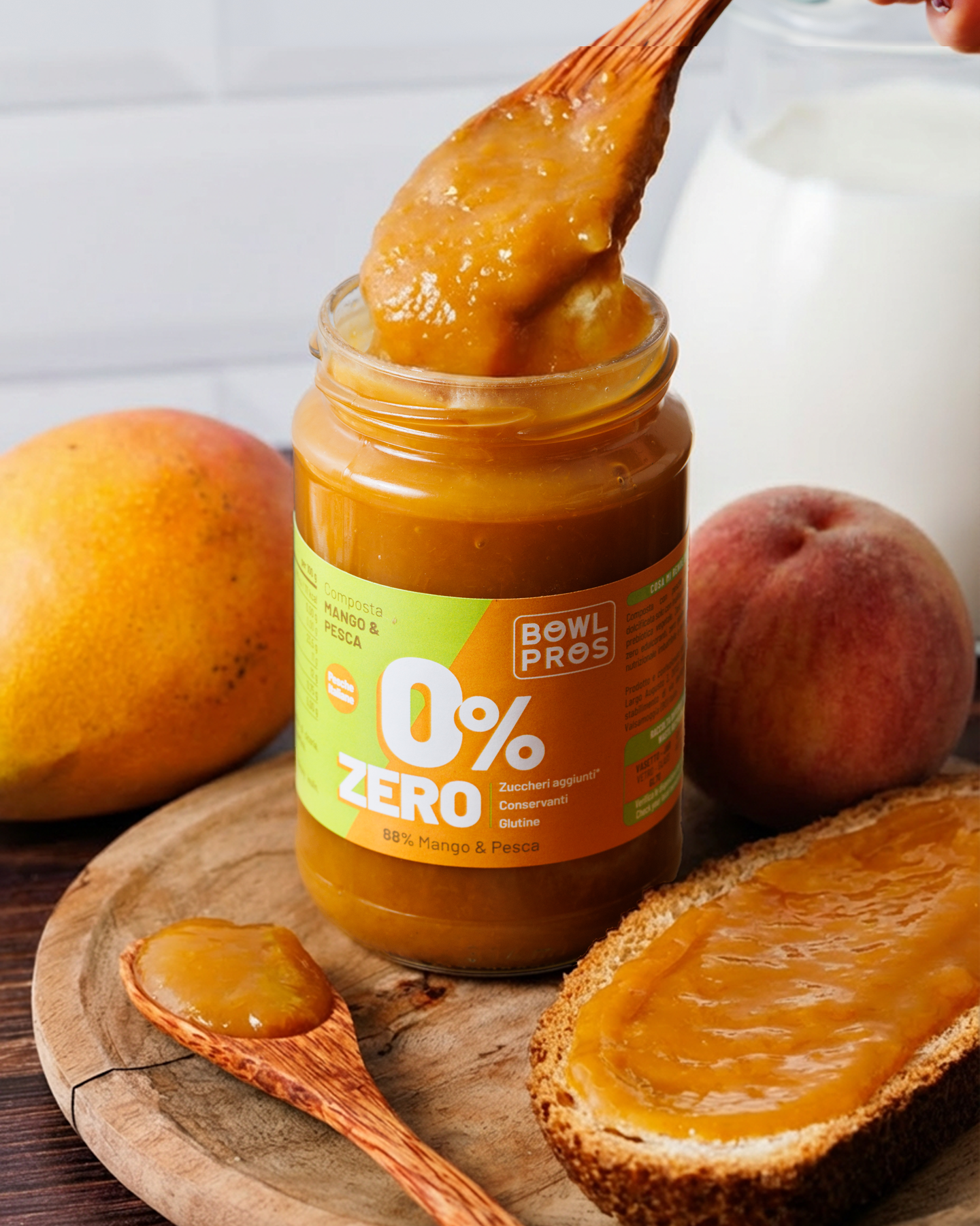 La Composta Mango e Pesca ZERO Bowlpros unisce la dolcezza vellutata delle migliori pesche italiane alla nota esotica e solare del mango, con una dolcezza naturale data dall'inulina di cicoria, una fibra vegetale priva di zuccheri e calorie.