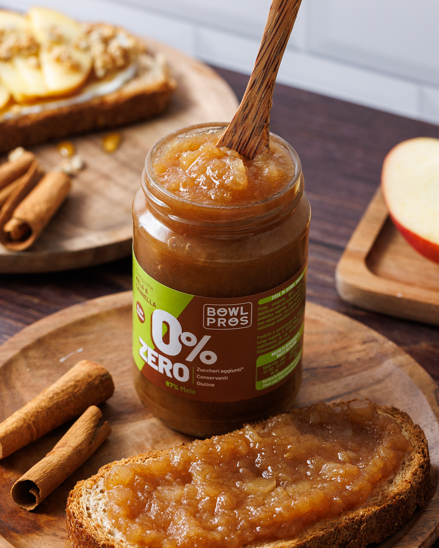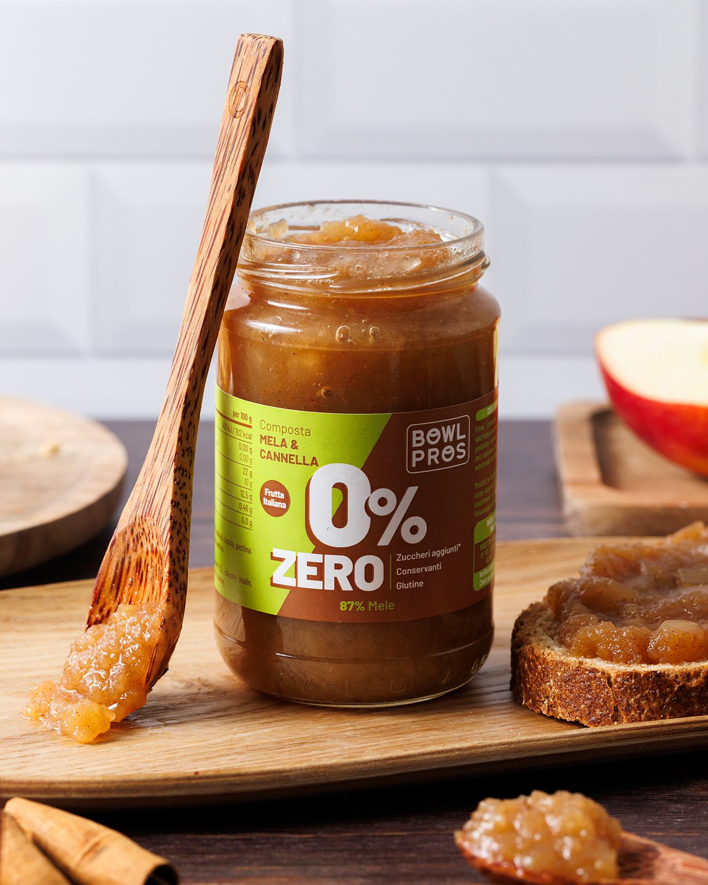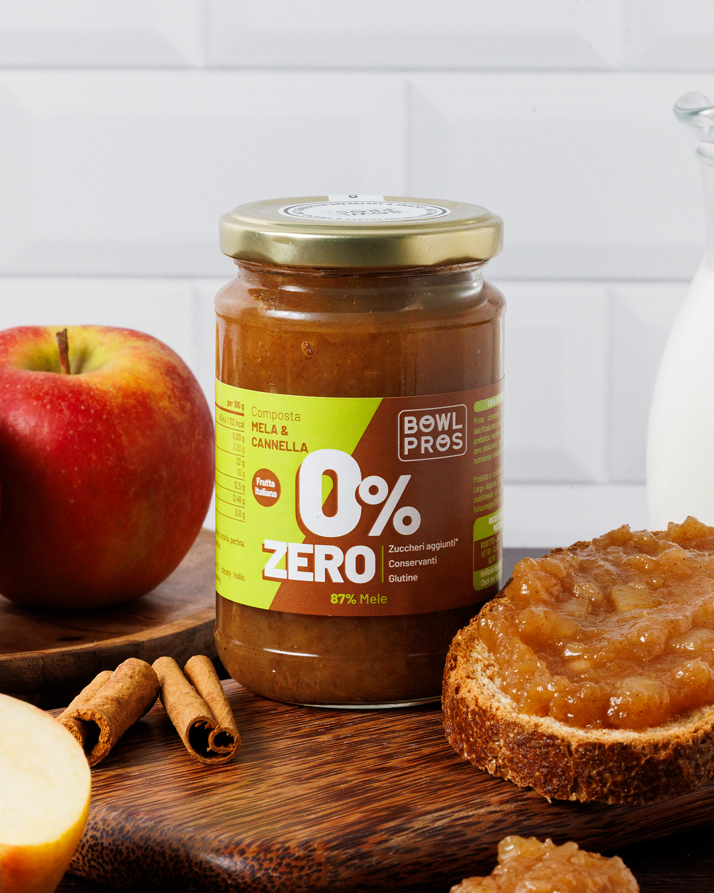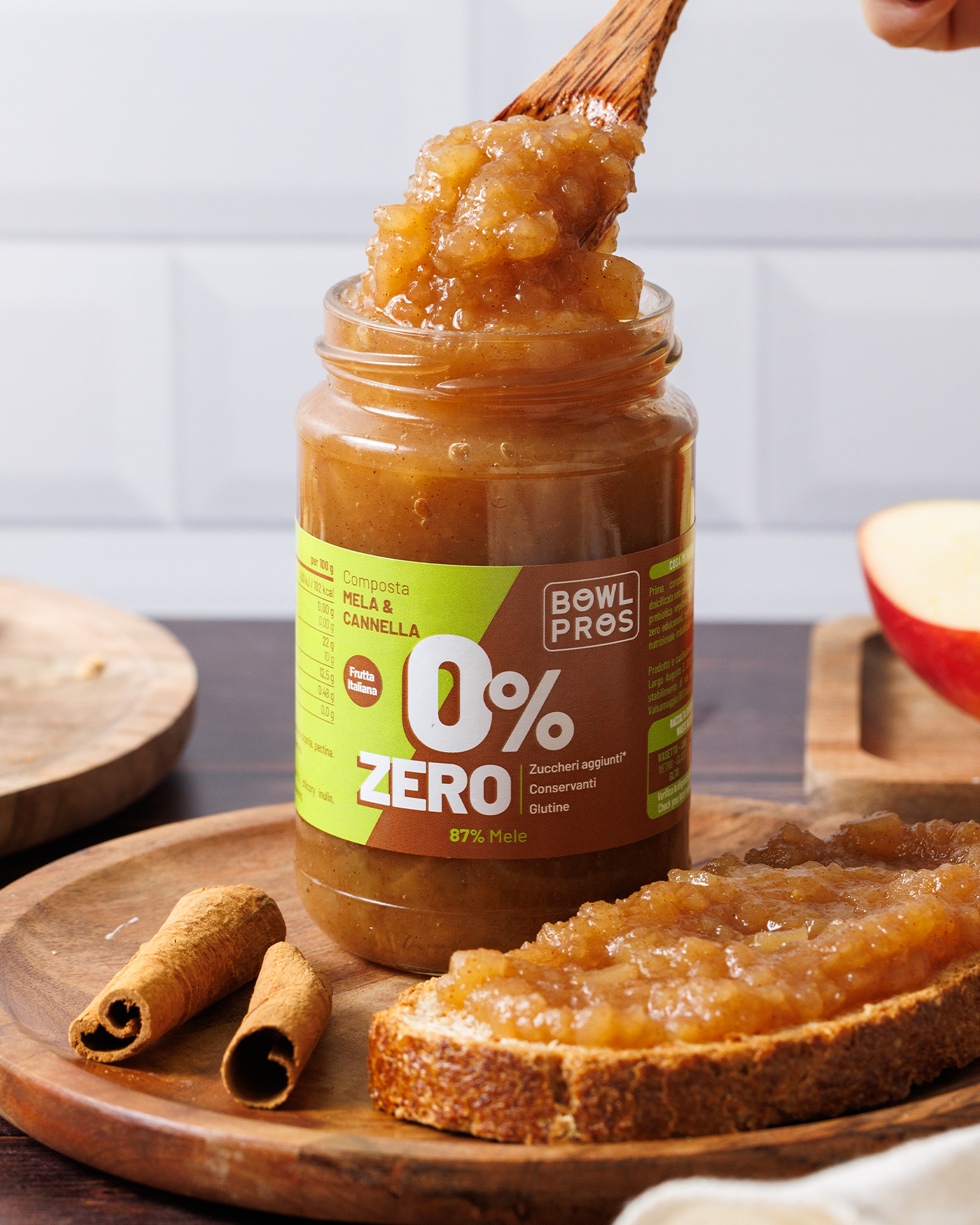 La Composta Mela e Cannella ZERO Bowlpros unisce la freschezza croccante delle mele italiane alla nota calda e avvolgente della cannella, con una dolcezza naturale data dall'inulina di cicoria, una fibra vegetale priva di zuccheri e calorie.