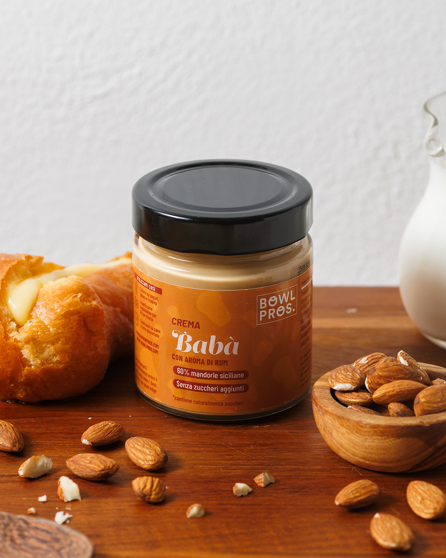 La Crema Babà Bowlpros nasce dall’unione tra la dolcezza delle mandorle siciliane (65%) e l’aroma naturale di rum, per una crema dal gusto avvolgente, raffinato e pieno di carattere.