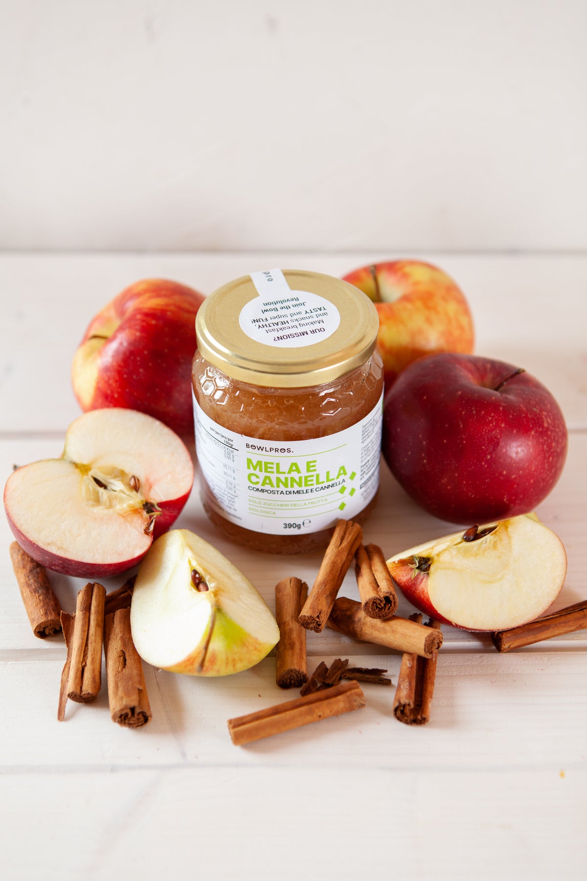 La Composta di Mela & Cannella Bowlpros è preparata con frutta 100% italiana e contiene solo zuccheri naturalmente presenti nella frutta.